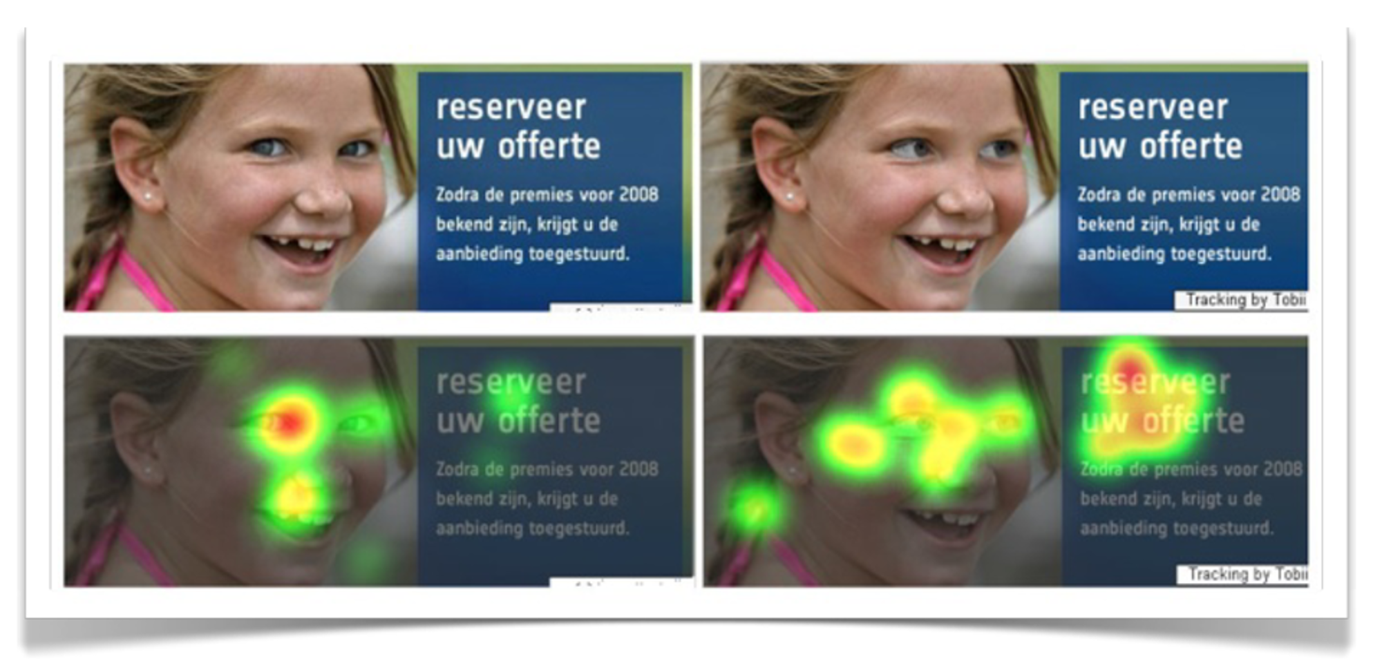 De kunst is om je Copy, Design en Structuur aan deze vier typen bezoekers te koppelen. Want dat is jouw munitie: Copy, Design en Structuur. Structuur zorgt dat je alle vier typen lezers bedient. Copy betekent: betere algemene teksten, betere teksten in de buttons en in de koppen van je artikelen. Wat op de website van Rinsma een ‘shirt met knoop en ritssluiting’ is, is bij Girav ‘een fijn wit T-shirt met hoge V-hals gemaakt van hoogwaardig Amerikaans stretch katoen’. Dat laatste is een productomschrijving op basis van emotie. Die werkt. En Design stuurt het oog. ‘Gaze Cueing’ gaat over de kijkrichting, over het sturen van ogen naar de gewenste plek op je website.