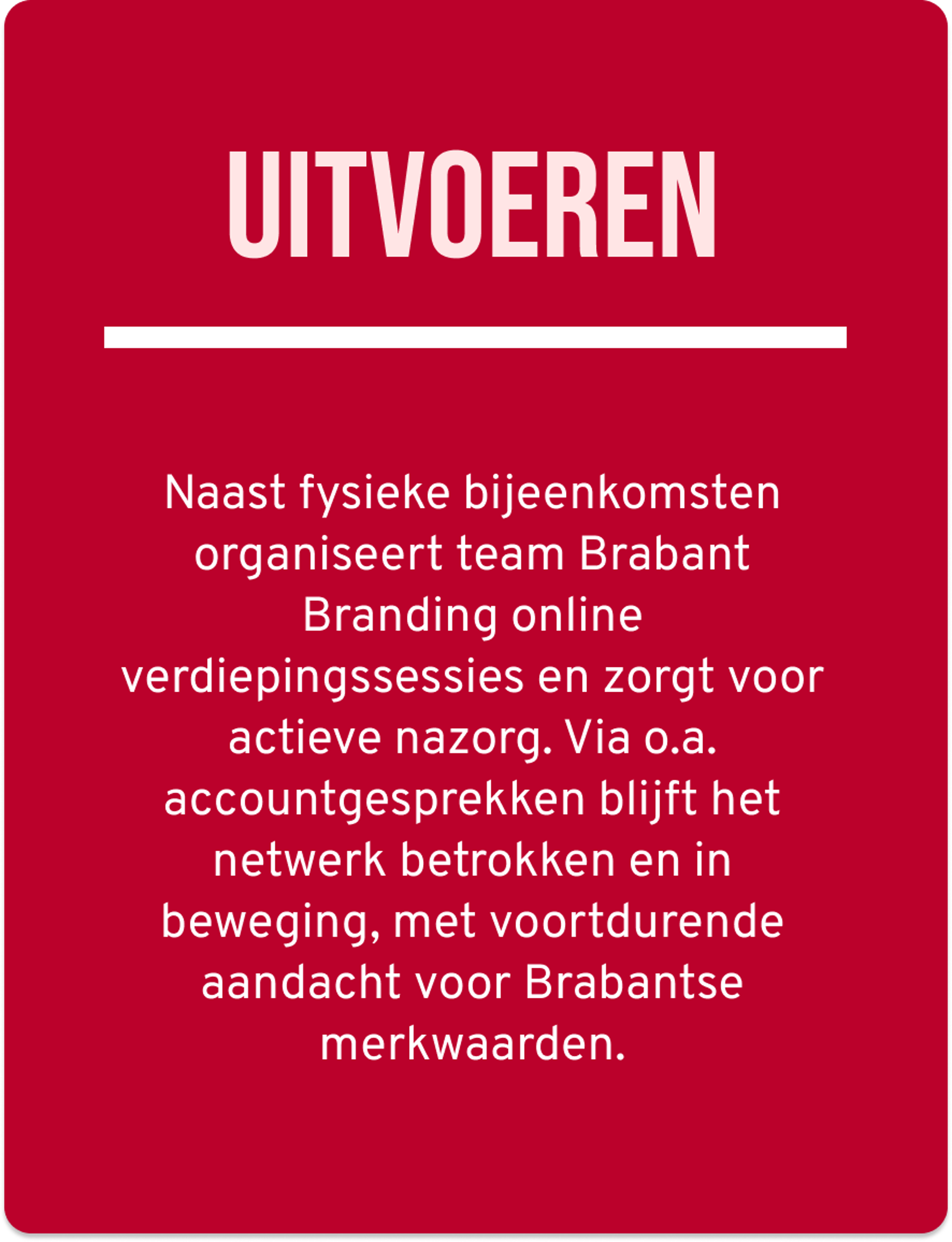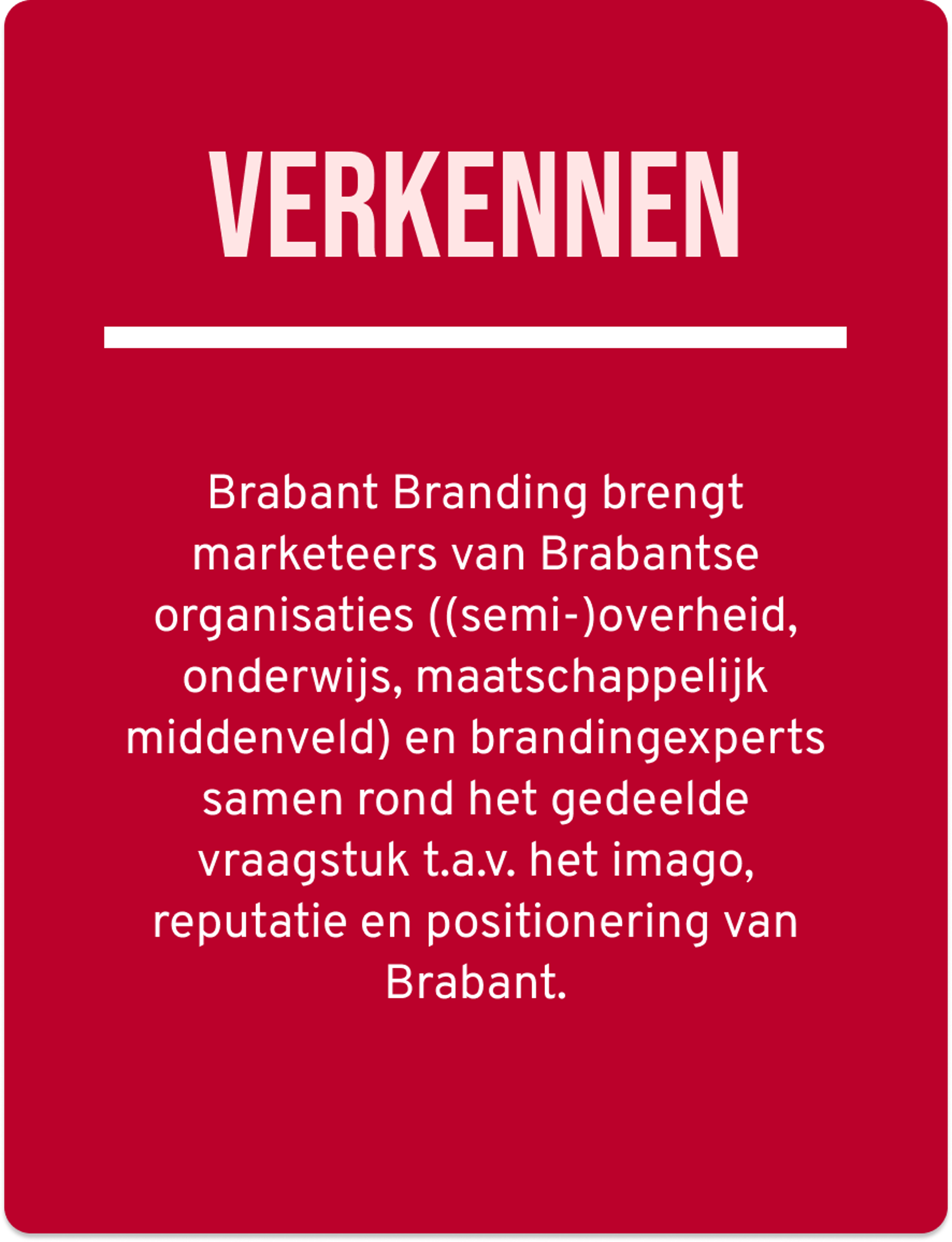 Door partners samen te brengen in een netwerk ontstaat ruimte voor samenwerking rond een gedeelde identiteit en gewenste reputatie. Het netwerk stimuleert een gedeeld verantwoordelijkheidsgevoel voor het imago van Brabant en vergroot het eigenaarschap onder partners. Door elkaar te ontmoeten, kennis uit te wisselen en gezamenlijk te reflecteren op brandingsvraagstukken, bouwen we gezamenlijk aan een sterker en consistenter regiomerk dat wordt gedragen door de regio zelf.